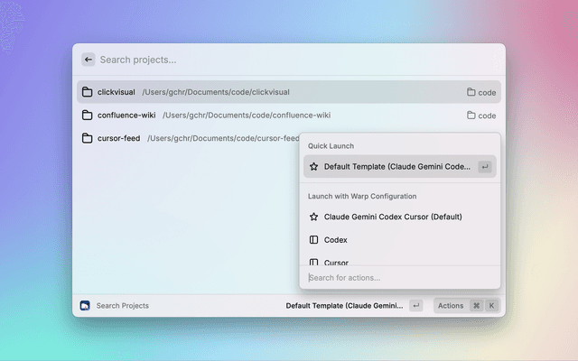 - 🚀 Quick Launch: One-click project startup with customizable Warp terminal configurations