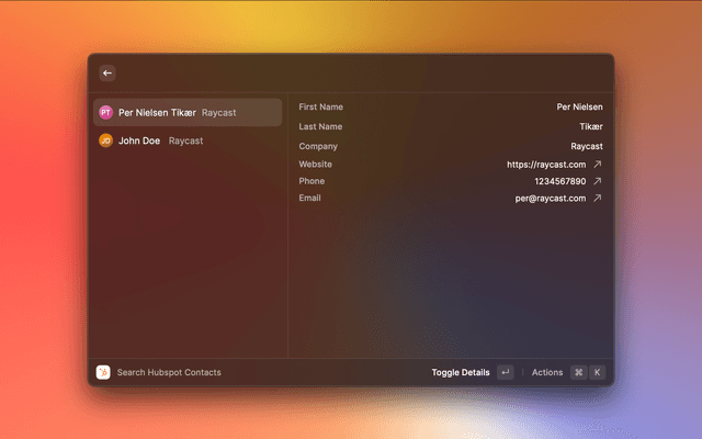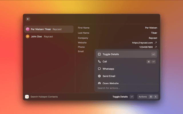 Disclaimer: This is not an official HubSpot product. It is a raycast plugin created by a third party and may not accurately reflect the features and capabilities of HubSpot products. Please refer to the official HubSpot website for accurate and up-to-date product information.