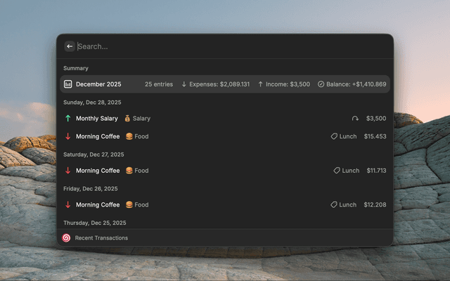 | Recent Transactions | View, edit, and delete recent transactions (beautifully grouped by date with summary headers) |