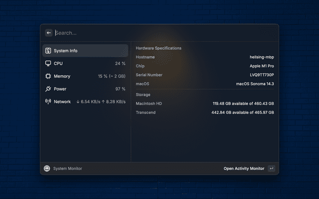 This is a Raycast extension that allows you to monitor your system's CPU, Memory, Disk and Battery usage.