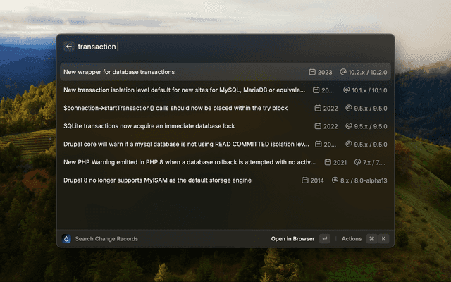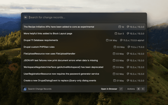 This command lets you search for Drupal Change Records. It will return the first page of results from the change records and also search based on keywords. You can open the change record in the browser by pressing Enter.
