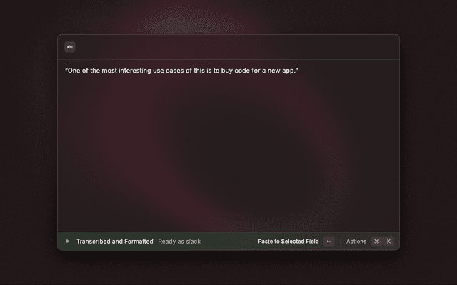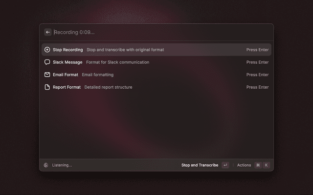 - Press Enter to stop and transcribe, or select a specific format (Email, Slack, Report)