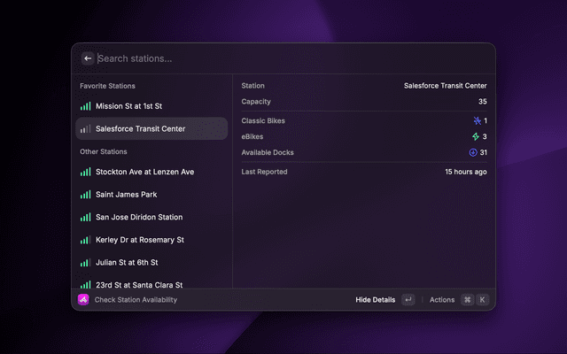 Check bike availability at bikeshare stations run by Lyft. You will be prompted to select a region on first run.