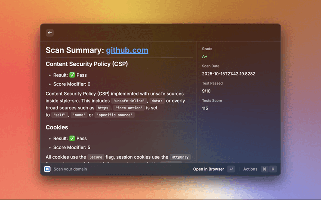 Run a HTTP Observatory Scan on your domain, provided by MDN