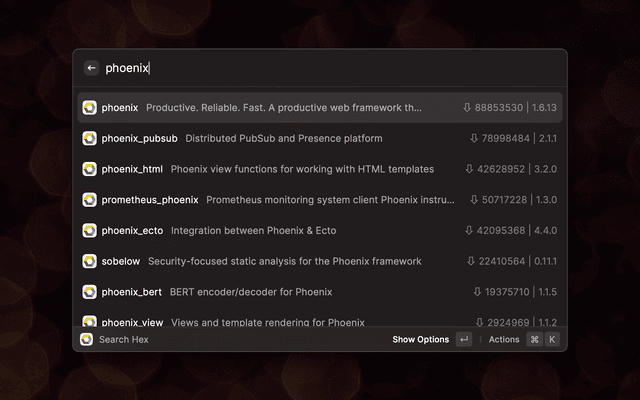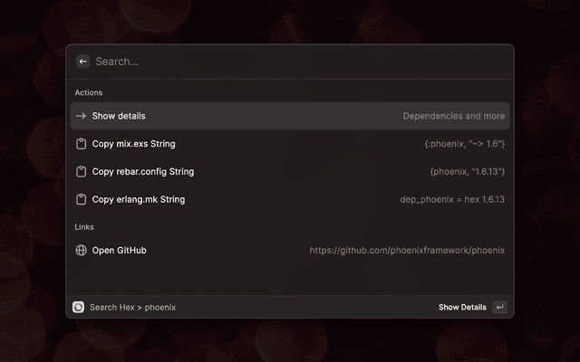This is a Raycast extension that enables you to quickly look up package information from Hex.