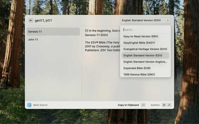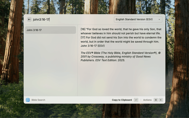 Instant access to the Word of God, right from your Raycast command bar. Search, read, and share Bible passages with speed and convenience.