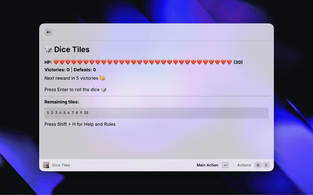 Dice Tiles is a fun and challenging game you can play directly in Raycast. Roll dice, select tiles to match the sum, and clear all tiles to win. Earn victories to unlock new rewards, see your life bar evolve, and reach higher achievement tiers.