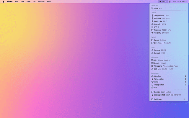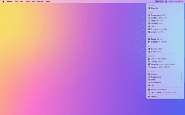Show current weather on the menu bar. Weather information updated every 30 minutes.
