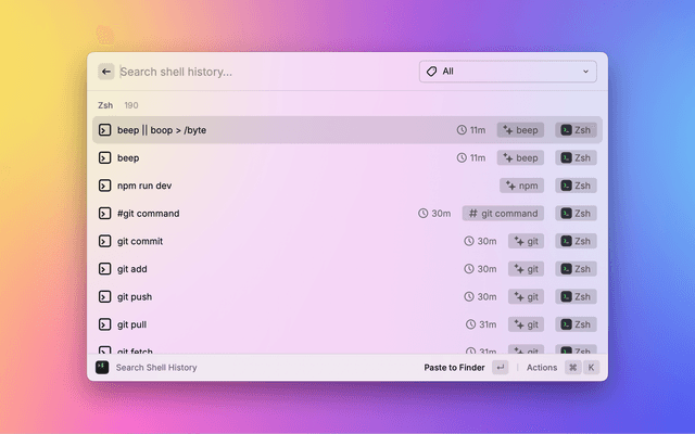 Search shell command history from zsh, bash, and fish.