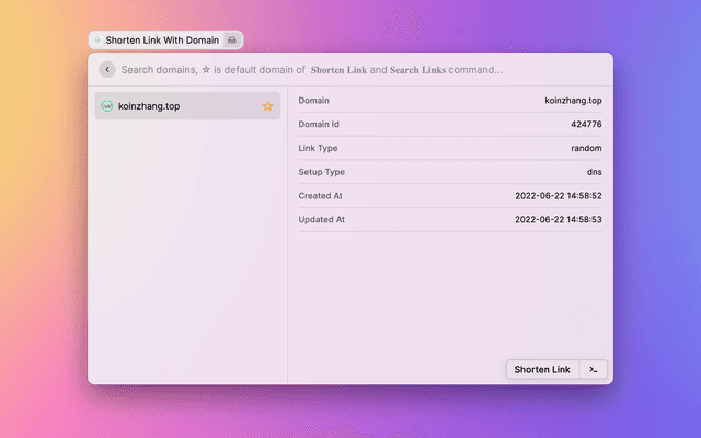 You can set default domain for Shorten Link and Search Links commands via the Shorten Link With Domain command (action: Set Default Domain, shortcut: Cmd+Enter).