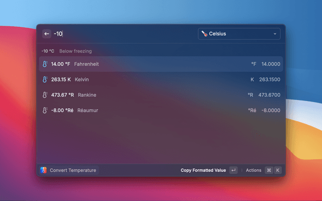 ⌘↵ - Copy formatted value (e.g., "77.00 °F")