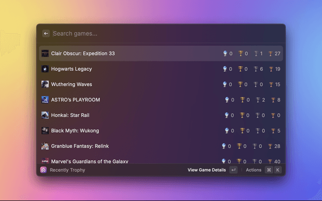A Raycast extension that allows you to access your PlayStation Network profile, view recently played games, and track your trophy progress directly from Raycast.