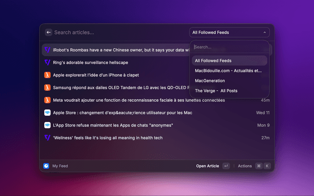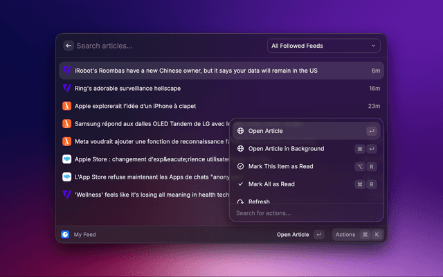 My Feed (Articles command): browse feed articles with fast keyboard actions.Saved Articles: view saved articles.Sources: browse followed sources and manage VIP/non-VIP status.Executive Summary: generate an AI executive brief from your unread feed items.Save).Mark This Item as Read).Mark All as Read).AI Summary).Executive Summary).Sources: