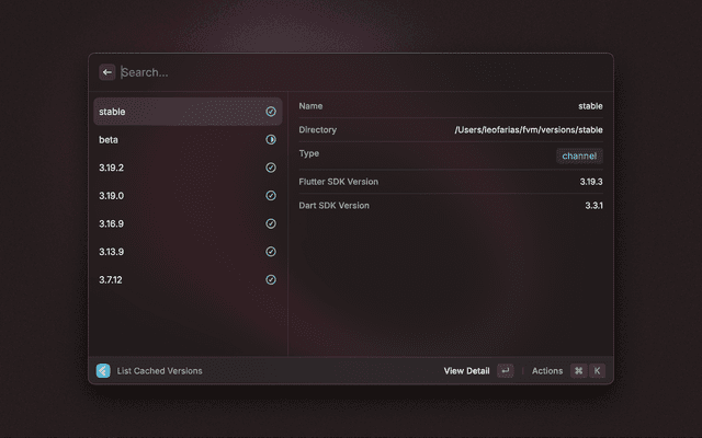 This extension uses the FVM CLI to manage installed Flutter SDKs. The extension uses its own FVM binary to avoid compatibility issues with the host system.