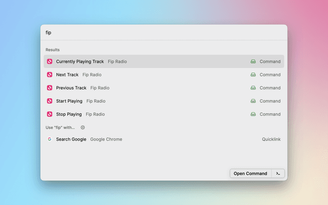 Start and explore the fip radio directly from Raycast