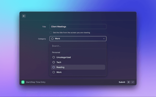 - You can start a new time entry by selecting "Create a new time entry" and inputting a title and category. Additionally, it's possible to automatically fetch the title from the page you are currently viewing.