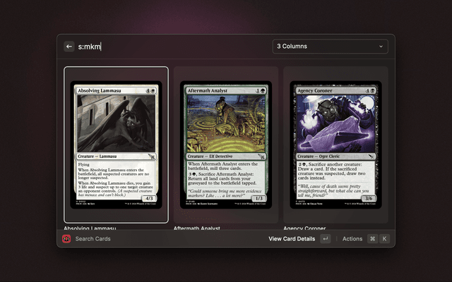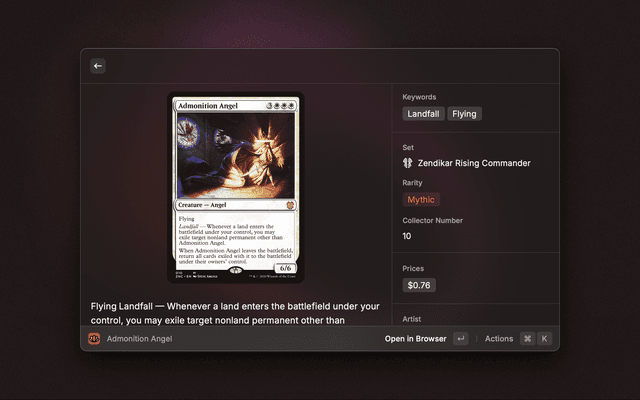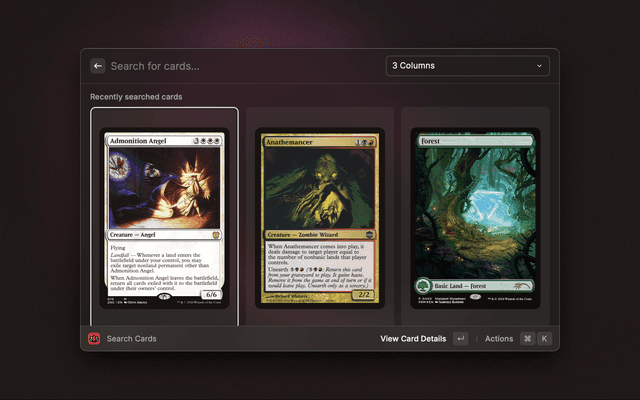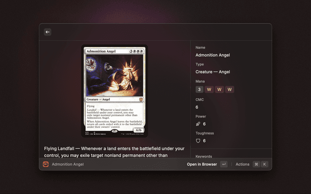 A non-official tool for Raycast to easily search for Magic The Gathering cards, sets, and rules - powered by Scryfall search.