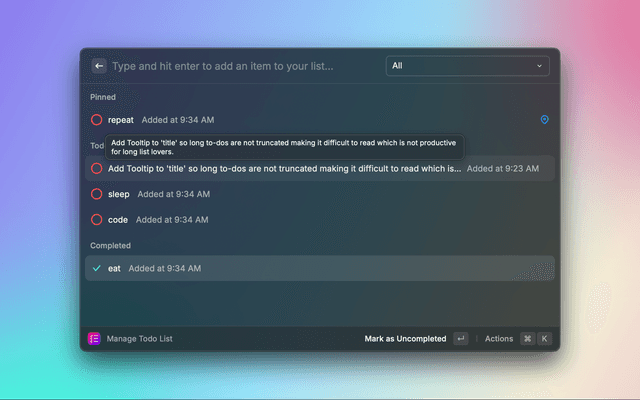 An extension for creating and managing a todo list. Create and delete items, mark tasks as completed and pin important items.