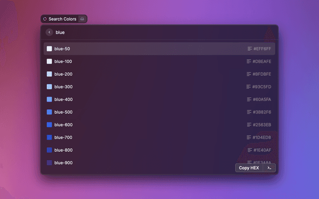 Pick a color to copy the hex value, the rgb value, or the TailwindCSS color name and paste elsewhere.