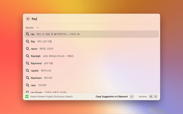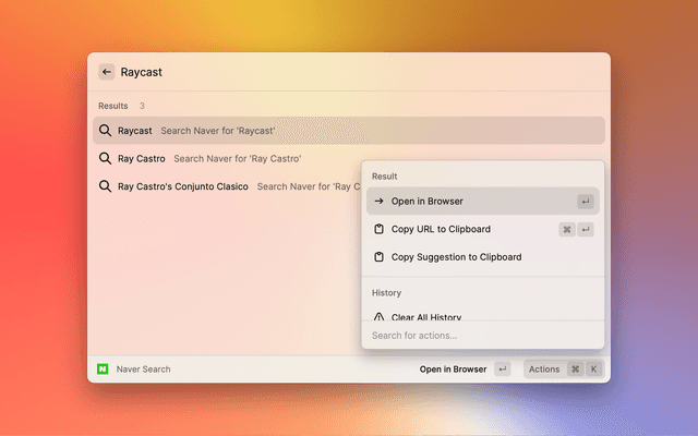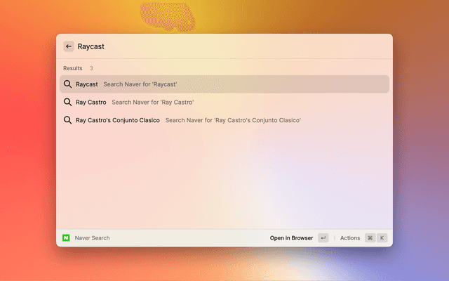 Naver search with autosuggestions is an extension for Raycast.
