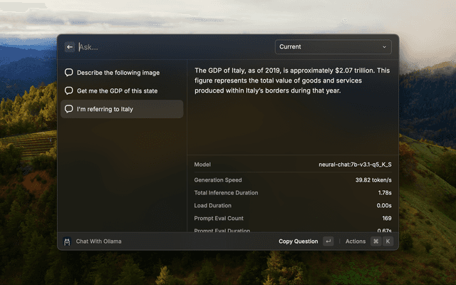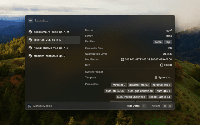 Ollama installed and running on your mac. At least one model need to be installed throw Ollama cli tools or with 'Manage Models' Command. You can find all available model here.