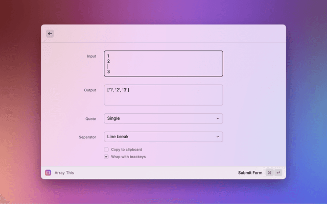 Raycast extension to format list of items into an array.