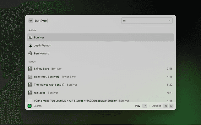 A single unified search command. Use this to search for artists, albums, songs, playlists, podcasts, and episodes. Use the dropdown menu to filter your search to a specific category. Each category offers contextual actions, so you can dive deeper into the search.