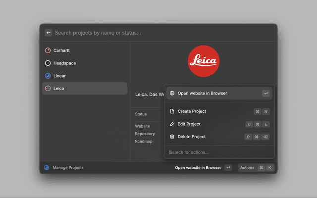 The Project Companion Raycast Extension allows you to manage your projects directly from Raycast. Use it to store project information like name, description, status, and links.