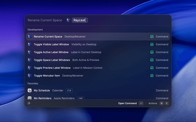 Control gitmichaelqiu's DesktopRenamer, an app that lets you rename and switch your macOS desktops, from Raycast.