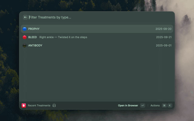 The extension includes two commands, Recent Treatments and Log Treatment.