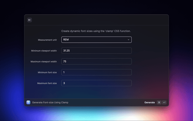 Create dynamic font sizes using the 'clamp' CSS function, using Raycast.