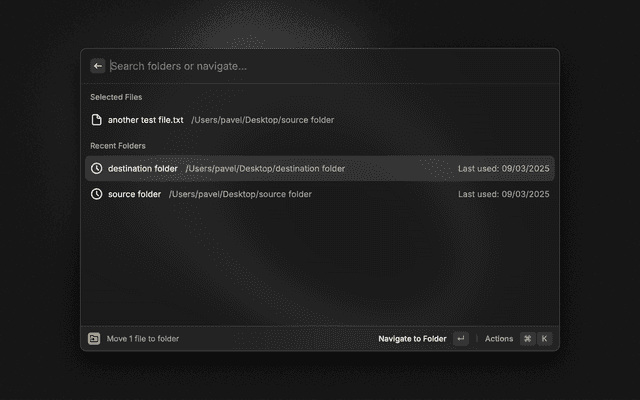 mdfind)Enter: Navigate to the selected folderCmd+Return: Move files to the selected folderCmd+Shift+Return: Copy files to the selected folderCmd+Shift+D: Toggle details viewCmd+Shift+P: Pin/Unpin folderCmd+Shift+R: Remove folder from recent history[!IMPORTANT] this extension is not available yet in the Raycast store. You can see the ticket here, so if you want to see it in the store, you can upvote it or smth. in the meantime, you can install it manually.