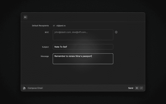 The fastest way to dash off a quick email to yourself and others. Inspired by Andrew Wilkinson's tweet.