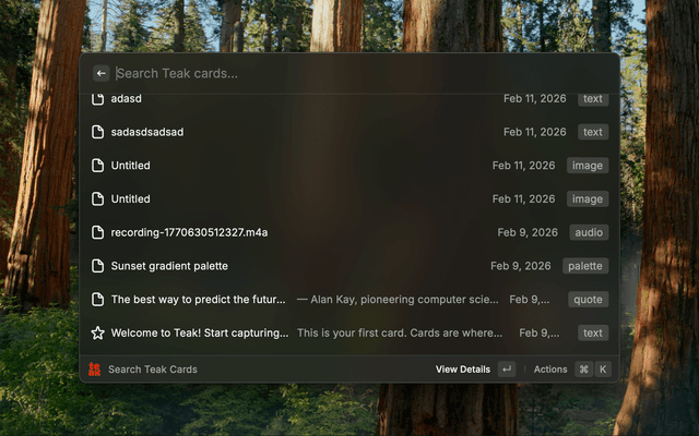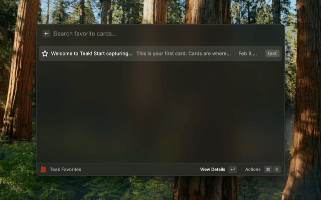 Quick Save: Save text or URLs to Teak without context switching.Search Cards: Search across Teak card content, tags, and metadata.Favorites: Open and copy from your favorited cards.https://app.teakvault.com/settingsapp.teakvault.com and api.teakvault.com.