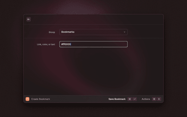 Create a new bookmark, whether it's a URL, a color, or a note. You can also select a group to save the bookmark to.