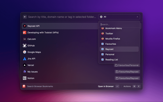 The extension retrieves bookmarks from two sources: your browsers and their profiles. The default browser is enabled by default, while the others are disabled. You can enable them using the Select Browsers action (⌘ + ⇧ + S). This will directly get your bookmarks.