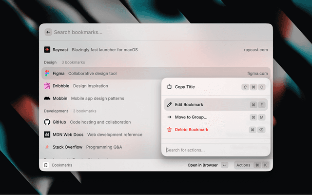 A Raycast extension that uses a markdown file as the persistence layer for your bookmarks. Organize your bookmarks with hierarchical groups using markdown headings.