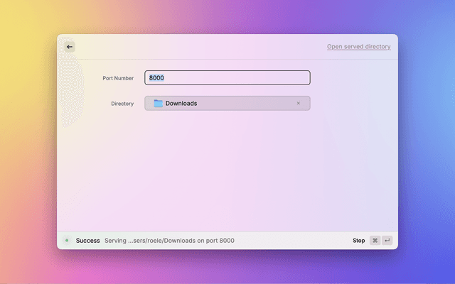 Default DirectoryYou can set the default directory to serve. The default directory is ~/Downloads.