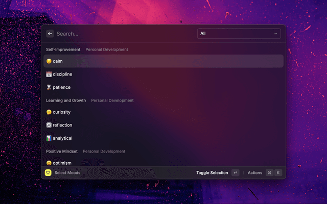 This Raycast extension is designed to assist users in clarifying their intentions and selecting appropriate moods for their tasks. It consists of two main commands: clarify-intention and select-moods. The select-moods command supports the clarify-intention command by providing a curated list of moods to enhance the intention setting process.