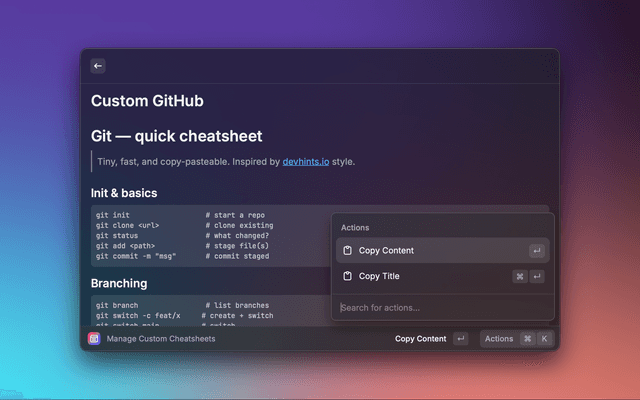Access a curated collection of DevHints cheatsheets plus the ability to create and manage your own custom sheets - all without leaving your keyboard. You can also import Markdown cheatsheets directly from your GitHub repositories and keep them up to date via a built-in Repository Manager. Search is smart and fast, prioritising titles over content so you find what you need instantly.
