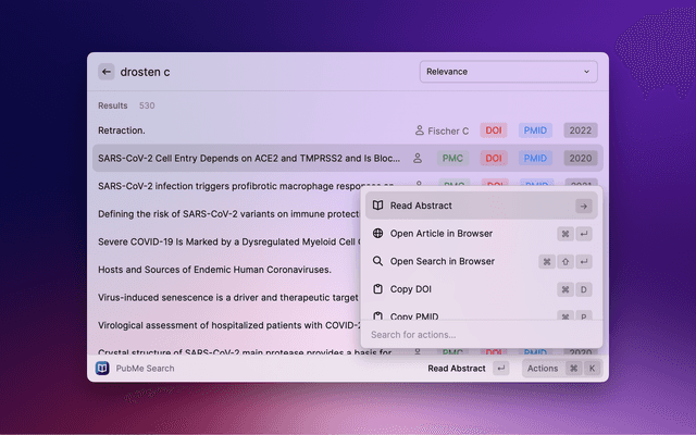 Search PubMed, a free database maintained by the National Library of Medicine (NLM), with Raycast. If the search entry is empty, 10 Trending Articles (from https://pubmed.ncbi.nlm.nih.gov/trending/) are displayed and cached. You can set the refreshInterval in settings.