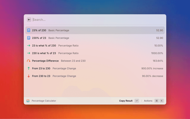 A comprehensive percentage calculator for Raycast that provides a Full Statistics view with colorful card-based results. Enter any two values and get a complete breakdown of all possible percentage calculations in one go!