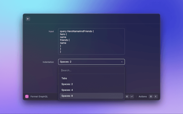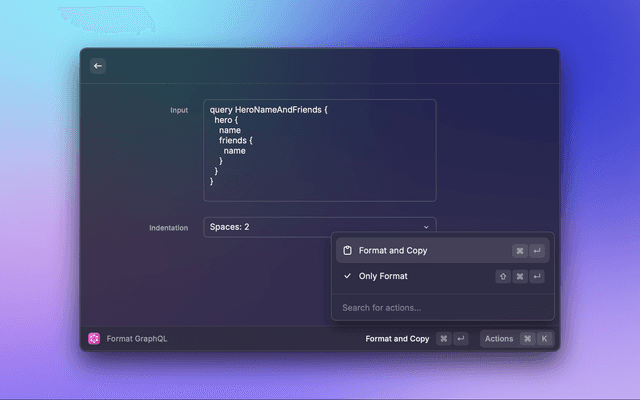 This is a simple extension for Raycast that takes a GraphQL input, formats it according to your indentation preference and copies the resulting formatted GraphQL to the clipboard