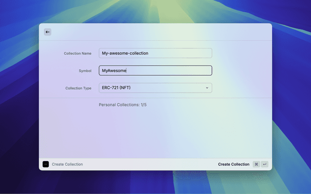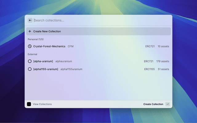 - Create Collections: Create and deploy new NFT collections (both ERC721 and ERC1155).