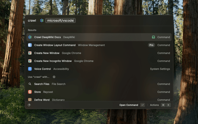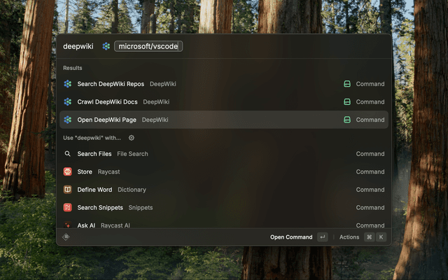 - Search DeepWiki Repos: Search for repositories indexed by DeepWiki directly within Raycast.