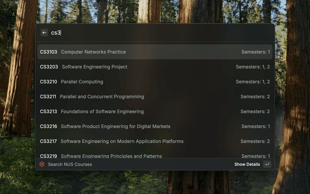 A Raycast extension to search and explore National University of Singapore (NUS) courses powered by NUSMods API.