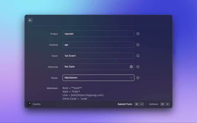 This is a Raycast extension for LogSnag. With this extension, you can Publish Events and Insights to LogSnag.