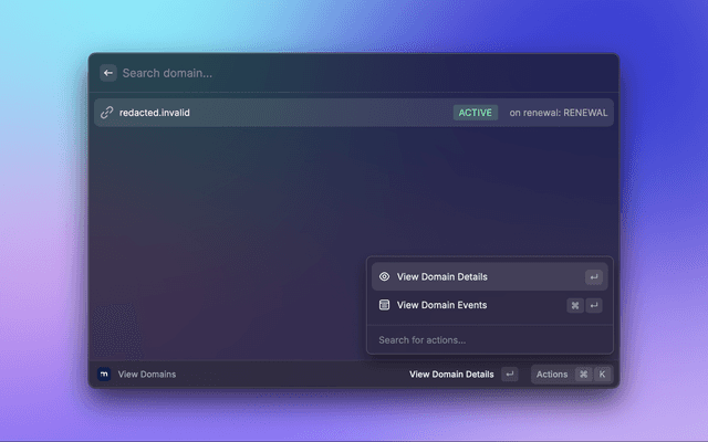 This is a Raycast extension for Manotori. With this extension, you can view domains in your account with their details and events.
