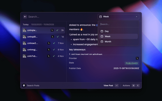 This is a Raycast extension for Postiz - The All-in-One Social Media Management Tool. With this extension you can: