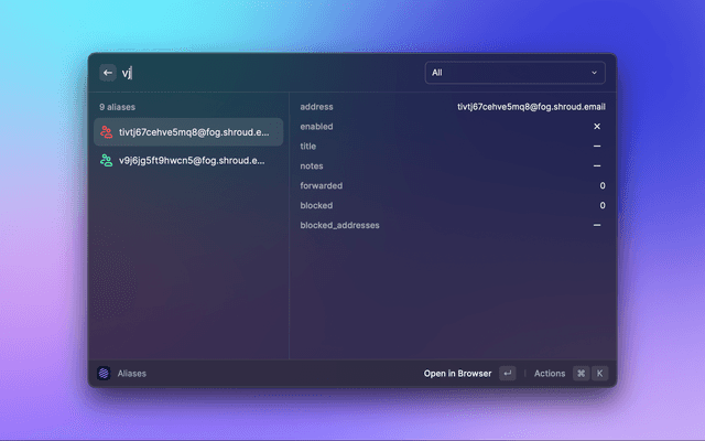 This is a Raycast extension for Shroud.email. With this extension, you can View Domains and Create or View Aliases in your Shroud.email instance.